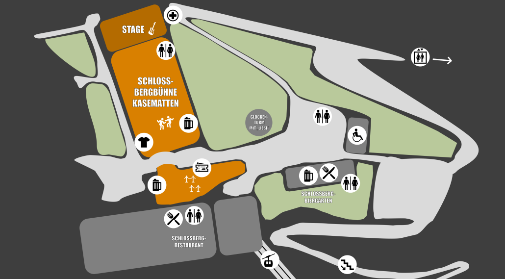 Diese alten Mauern umfassen eine große, leicht abfallende Fläche hin zur Bühne. Die Nischen in den Mauern bieten Platz für Logen. Durch eine mobile Überdachung und die neu angebrachte Verglasung der Rückseite ist die Schloßbergbühne Kasematten wetterunabhängig bespielbar.